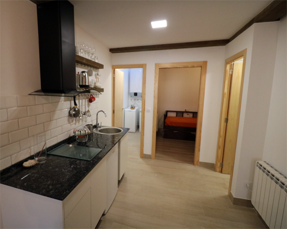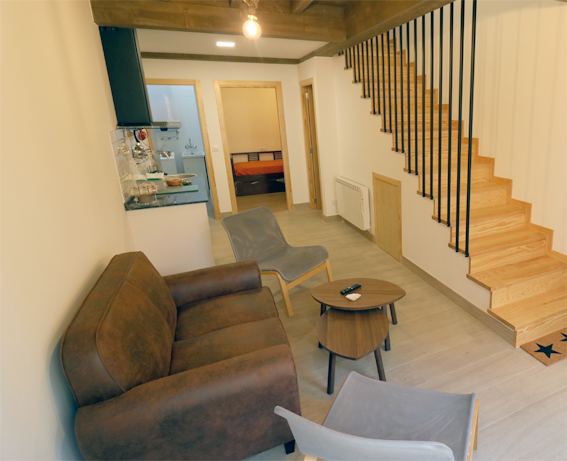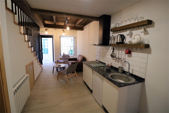 Salón – Cocina. La planta baja dispone de un salón con cocina integrada con todos los utensilios y electrodomésticos para comer en el alojamiento. El salón ofrece una zona de descanso con sofás y televisión.